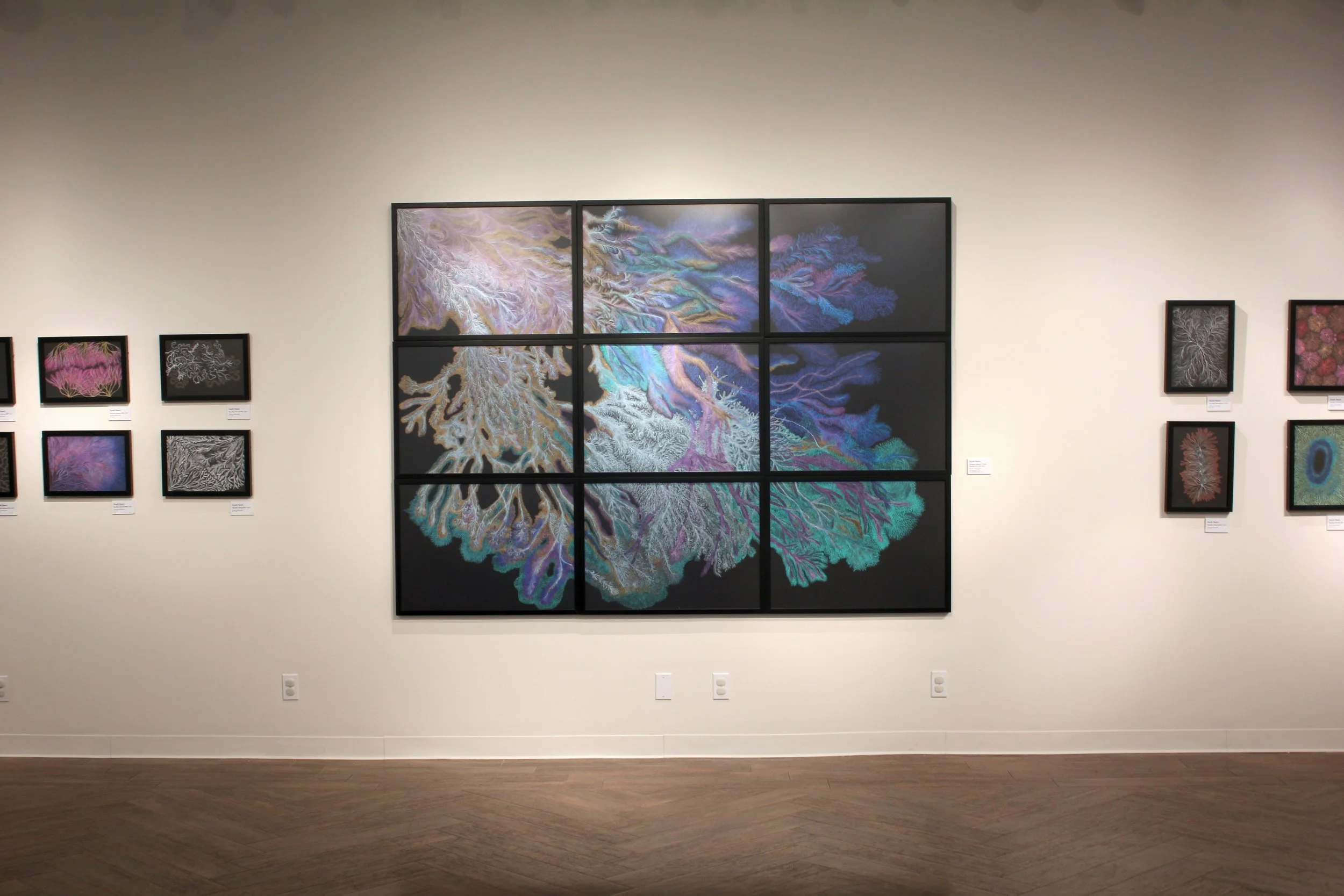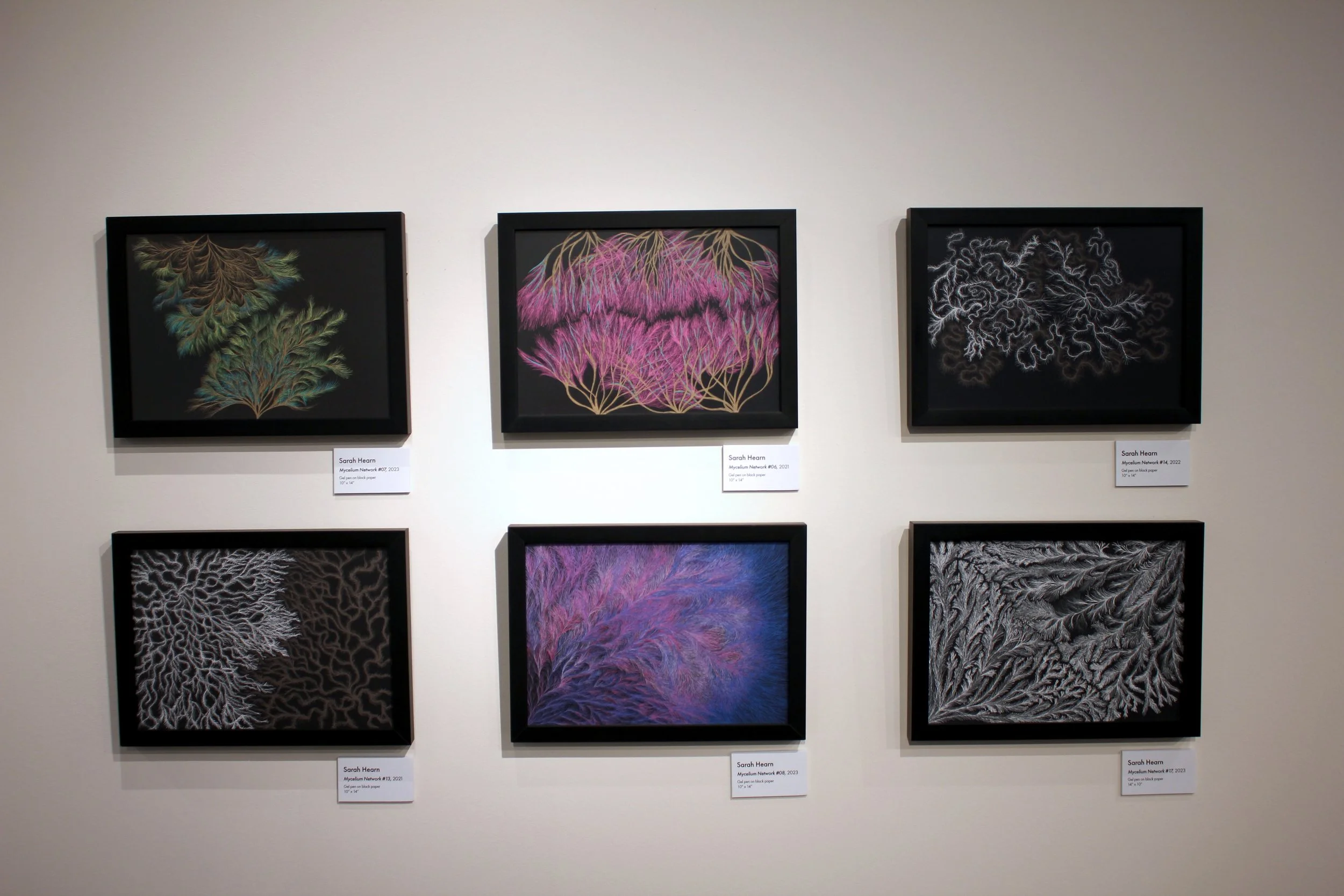 Image: Sarah Hearn, Mycelium Network Polyptych. 9 panels, individual dimensions: 22 x 30”, overall dimensions: 66 x 90”. Gel pen on black paper, 2023.